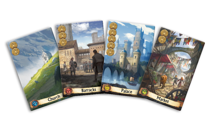 Within Citadels, there are 84 district cards, most of which fall under one of four categories. These are Noble, Religious, Trade, and Military. The four types will often correspond to specific abilities from specific characters, like the Merchant earning more gold for each Trade district, or the Bishop gaining the same for Religious districts. Learning which districts to play at what time, and which ones work with specific characters are key aspects of succeeding at Citadels.